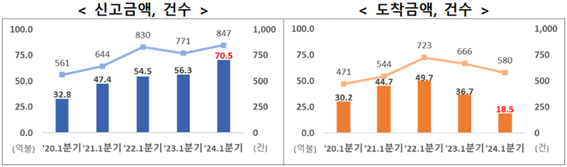 올해 1분기 외국인직접투자는 신고 기준 전년 동기 대비 25.1% 증가한 70억 5000만 달러를 기록하며 역대 1분기 최대 실적을 경신한 것으로 나타났다.