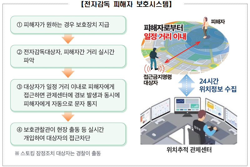 강화된 전자감독 피해자 보호시스템은 전자감독대상자가 피해자에게 일정 거리 이내로 접근하면 관제센터에 경보가 발생함과 동시에, 피해자에게 대상자의 위치가 문자로 전송되고 보호관찰관 또는 경찰이 현장에 출동해 피해자를 보호 조치하는 방식이다.
