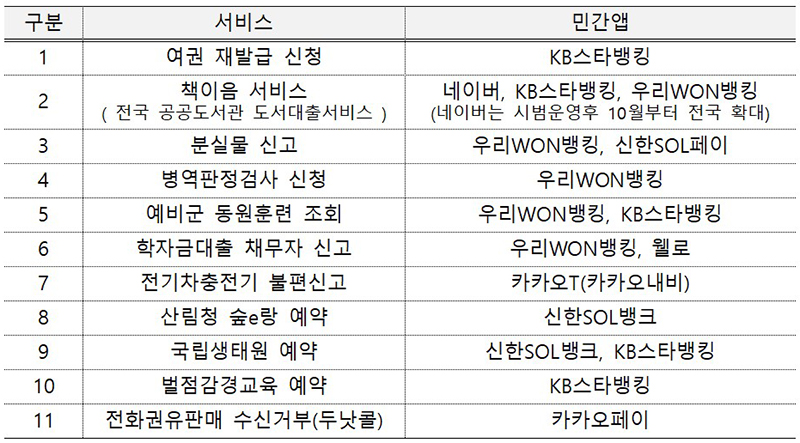 한편 그동안 KTX·SRT 승차권 예매, 자동차검사 예약, 국립수목원 예약, 국립자연휴양림 예약, 문화누리카드 등 9종 서비스는 이미 네이버, 카카오T, 토스, KB스타뱅킹 등에서 이용 가능하다.