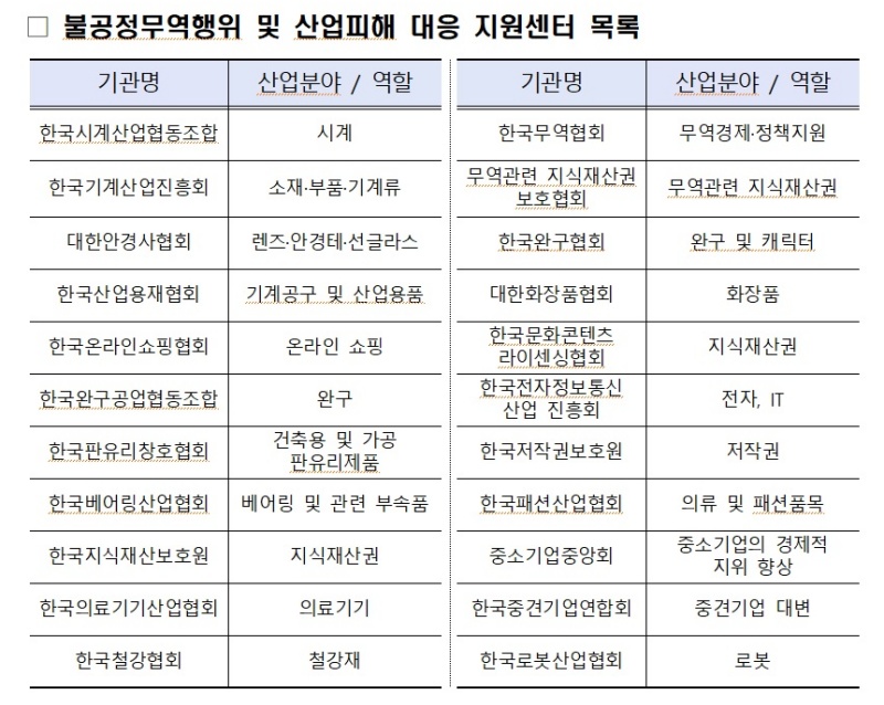 산업통상자원부 무역위원회는 19일 불공정무역행위로 인한 우리 기업의 피해 대응을 포괄적으로 지원하기 위해 업종별 협회·단체 위주로 22개 ‘불공정무역행위 및 산업피해 대응 지원센터’를 구성해 이날 출범 간담회를 열었다고 밝혔다.
