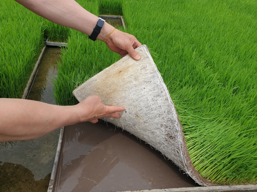 고온 육묘 관리= 모를 기를 때 고온 피해를 줄이려면, 바닥 육묘가 알맞다. 선반 육묘는 모가 웃자랄 수 있고, 매트 형성이 어려울 수 있어 지양한다. 바닥 육묘 기간은 8~12일 정도이다. 시설(하우스)에서 모를 기를 때는 통풍에 신경 써 25도 이하로 유지되게 관리한다. 물주는 횟수는 하루에 1~2회가 적당하다. 물을 너무 자주 주거나 상시로 물에 담그면 뿌리가 잘 자라지 않고 모가 웃자랄 수 있다.